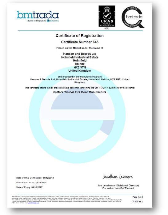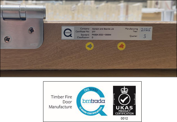 Hanson & Beards Ltd products are manufactured under Trada ‘Q’ Mark, an approved third-party certification scheme to the requirements of BS 476 part 22, or EN 1634 part 1.