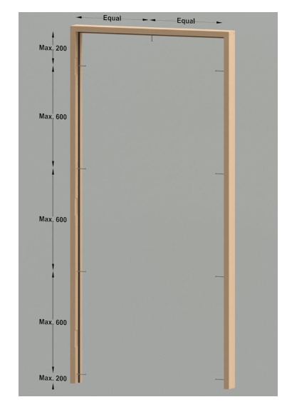 Position the frame centrally in the width of the structural opening. Pack between door frame and prepared opening immediately behind each fixing point. Ensure fixing points are securely packed and the frame cannot be distorted when fixed with screws.